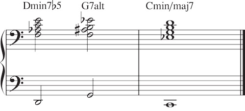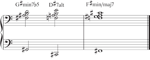 Ex. 1cはマイナーのルートレスヴォイシングによる ii-V-i進行のA-フォームです。