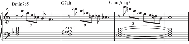 ここにあるのは、Cマイナーのii-V-i進行上での彼の代表的なリックです。