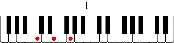 これが三和音の基本形となります。そして、1つのキーの中で7つの三和音を作ることができます。キーの中でどこでも、3本の指で間に鍵盤を1つ挟んで押してコードを作ります。この白鍵上で三和音を平行移動しながら7つのコードを鳴らしてみましょう。