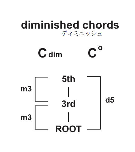 マイナーコードの5度を半音下げるとディミニッシュコードが出来上がります。このとき、ルートと3度の関係、3度と5度の関係はどちらもマイナー3rdで、ルートと5thの関係はディミニッシュ5thとなります。