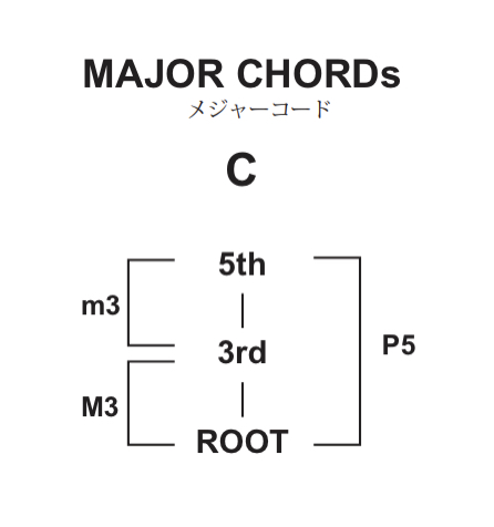 ルートに対して3度がメジャー3rd、5度がパーフェクト5th、そして3度と5度の関係がマイナー3rdで構成される三和音をメジャートライアド(Major Triad)といいます。