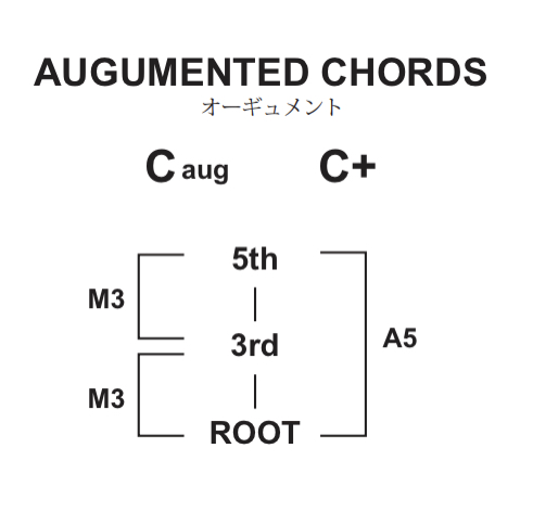 最後に、メジャーコードの5度を半音上げるとオーギュメントコードが出来上がります。このとき、ルートと3度の関係、3度と5度の関係はどちらもメジャー3rdで、ルートと5thの関係はオーギュメント5thとなります。