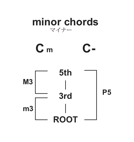 ルートに対して3度がマイナー3rd、5度がパーフェクト5th、そして3度と5度の関係がメジャー3rdで構成される三和音をマイナートライアド(minor Triad)といいます。